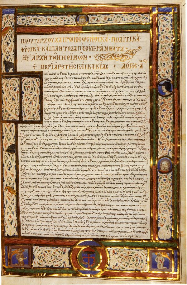 В последние годы XIII — начале XIV века были выполнены максимально полные на тот момент копии «Сравнительных жизнеописаний» и «Моралий» под редакцией Максима Плануда (recensio Planudea)[377]. Деятельность Плануда оказала большое влияние на сохранность корпуса сочинений Плутарха[281]. Под редакцией Плануда текст греческого автора претерпел некоторую лингвистическую и стилистическую редакцию для использования его сочинений в учебных целях[378]. Плануд имел доступ в крупнейшие библиотеки Византии и, возможно, использовал назначение в направлявшееся в Италию посольство для изучения оказавшихся там рукописей[276]. В начале XIV века независимо от Плануда византийские филологи предприняли альтернативную попытку собрать всё наследие Плутарха с попыткой реконструкции изначального текста[379].
