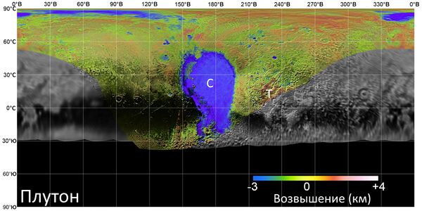 В 2015 году по изображениям с АМС «Новые горизонты» на Плутоне обнаружены обширная светлая зона в форме символа сердца размером 1800×1500 км; в экваториальной зоне — резко возвышающиеся над в целом сглаженной ледяной поверхностью 3,5-километровые горы, состоящие, предположительно, из водяного льда, и много других деталей поверхности[5][87]. Им были даны предварительные имена (по состоянию на июнь 2016 года эти имена не утверждены рабочей группой по номенклатуре планетной системы МАС, поэтому могут измениться).