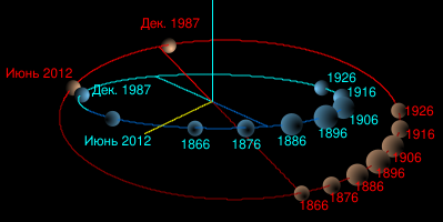 Большой эксцентриситет орбиты приводит к тому, что часть её проходит ближе к Солнцу, чем Нептун. Последний раз такое положение Плутон занимал с 7 февраля 1979 по 11 февраля 1999 года. Вычисления показывают, что в предыдущий раз он был в таком положении с 11 июля 1735 по 15 сентября 1749 года (всего 14 лет), тогда как с 30 апреля 1483 по 23 июля 1503 года он находился в таком положении 20 лет. Из-за большого наклона орбиты Плутона к плоскости эклиптики она не пересекается с орбитой Нептуна. Проходя перигелий, Плутон находится в 10 а. е. над плоскостью эклиптики. К тому же период обращения Плутона равен 247,92 земного года[1], и Плутон делает два оборота, пока Нептун делает три. В результате Плутон и Нептун никогда не сближаются менее чем на 17 а. е.[60][61]