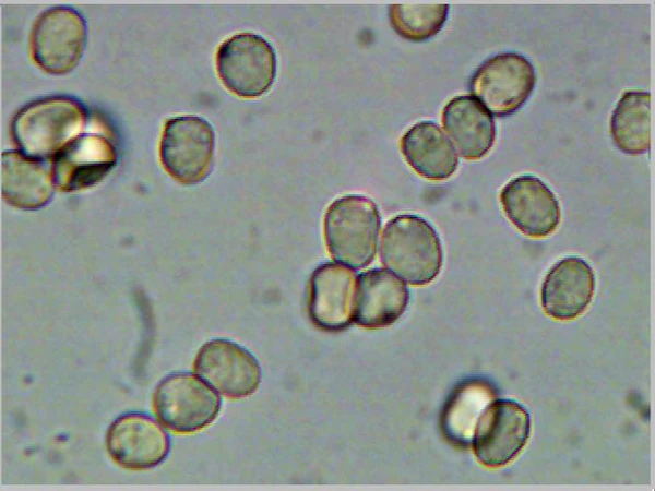 Споровый порошок розовый. Споры 8—9 х 5—6 мкм, коротко-эллипсоидные, гладкие, розоватые. Цистиды с толстыми стенками и апикальными придатками («рожками»)[8].