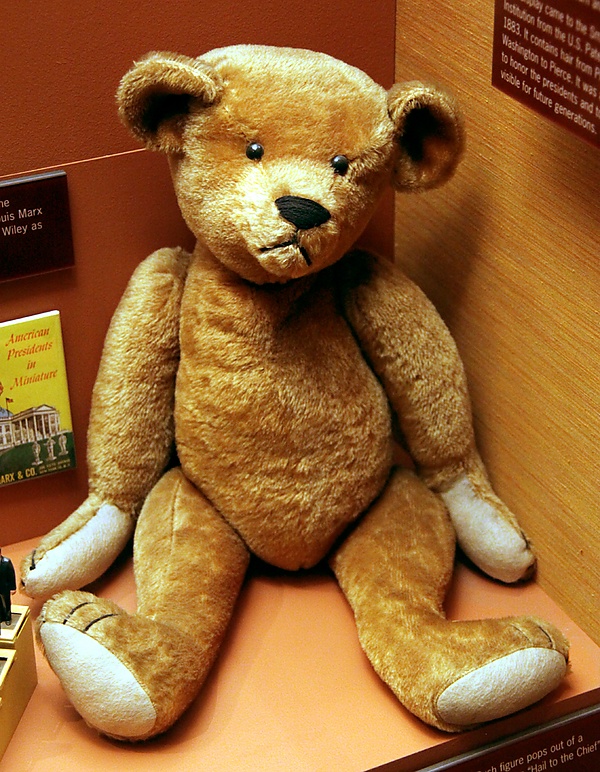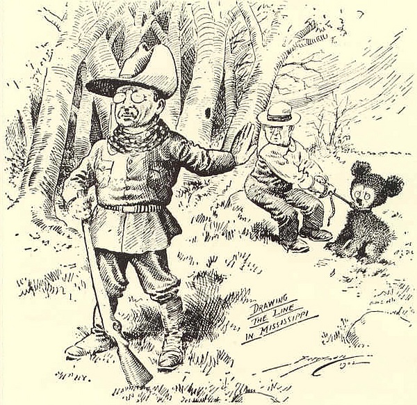 В 1902 году президент США Теодор Рузвельт пощадил на охоте американского чёрного медведя, загнанного охотничьей командой с собаками, полузабитого и привязанного к дереву (иве). Рузвельта пригласили отстрелить добычу. Он отказался сделать это сам, мотивируя тем, что это «неспортивно», но распорядился медведя пристрелить, дабы прекратить его мучения. История попала в газетные карикатуры, но со временем была адаптирована по конъюнктурным соображениям, и медведь превратился в маленького симпатичного медвежонка (в карикатуре в «Вашингтон пост» от 16 ноября 1902 г.). Детали истории со временем размылись, осталась главная — Тедди (прозвище Рузвельта) отказался стрелять в медвежонка. Одна из карикатур с уменьшенным до медвежонка масштабом попалась на глаза жене Морриса Мичтома, эмигранта из России (настоящее имя — Михаил Мишим[1]), владельца магазина игрушек. Она и сшила первого медвежонка, похожего на медведя из карикатуры. Он был установлен в витрине магазина и назван «Медвежонок Тедди», в честь президента Рузвельта. Новая игрушка вызвала у покупателей небывалый интерес и вскоре, получив согласие Рузвельта на использование его имени, Мичтом основал компанию Ideal Toy Company, занимавшуюся выпуском игрушечных медвежат. Хотя успех медвежат был колоссальным, это не принесло Мичтому богатства. Он допустил серьёзную ошибку — не запатентовал новую игрушку и её название. Вскоре появилось множество компаний, выпускающих похожих медвежат и использующих его идею.