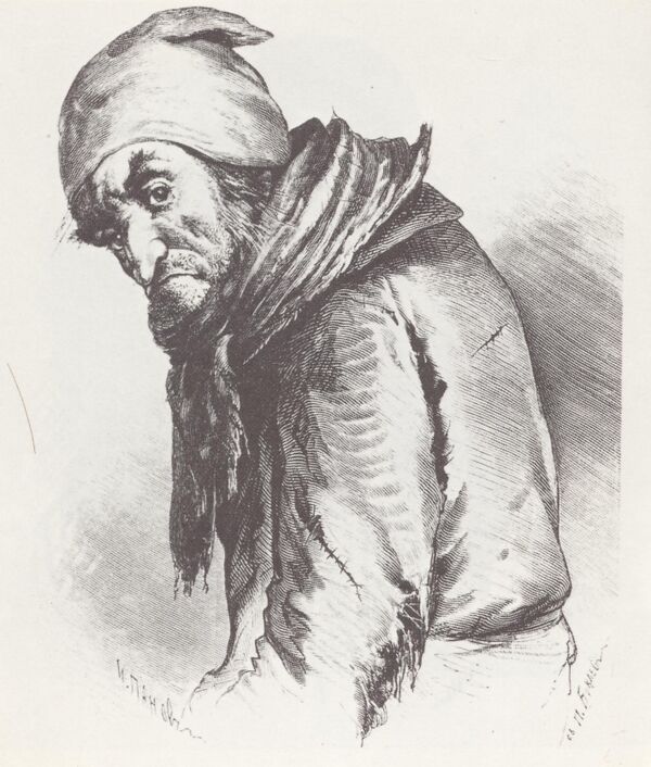 Писатель даёт описание следующее внешности своего необычного героя: лицо его не представляло ничего особенного и выглядело как и у других худощавых стариков. Лишь подбородок выступал очень далеко вперёд, да привлекали внимание маленькие глазки, бегавшие как мыши из-под высоко поднятых бровей. Гораздо замечательнее был наряд его: никакими средствами и стараньями нельзя бы докопаться, из чего состряпан его халат: рукава и верхние полы до того засалились и залоснились, что походили на юфть, какая идёт на сапоги; позади вместо двух болтались четыре полы, из которых охлопьями лезла хлопчатая бумага. На шее тоже было повязано что-то такое, которого нельзя было разобрать: чулок ли, подвязка ли, или набрюшник, только никак не галстук.