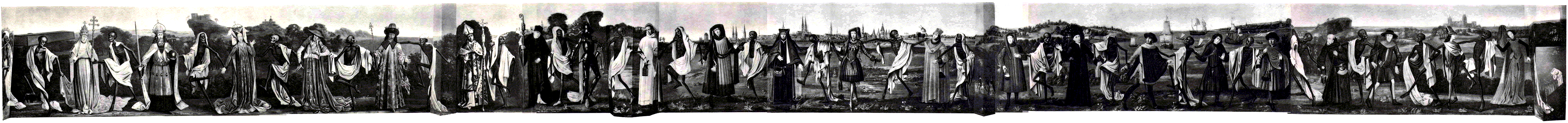 На неё походили картины в церкви предикаторов в Страсбурге, а также картины, написанные Н. Мануэлем (в первой половине XV века) на стенах кладбища в монастыре того же ордена в Берне. Вообще, братья этого ордена считали, по-видимому, подобные картины немаловажным пособием для достижения своей цели — внушения религиозного страха слушателям и обращения грешников на истинный путь. В 1534 году герцог Георг Саксонский приказал исполнить и поместить на стене третьего этажа своего дворца в Дрездене длинный каменный рельеф, представляющий Пляску смерти в 27 фигурах натуральной величины; этот рельеф сильно пострадал во время пожара 1701 года, но был реставрирован и перенесён на кладбище дрезденского Нойштадта, где его можно видеть и ныне. По усовершенствовании искусства гравирования и изобретении книгопечатания стали расходиться в большом количестве народные, общедоступные картинки Пляски Смерти в виде отдельных листов или тетрадок со стихотворным текстом и без него. Самое знаменитое из таких изданий — серия 58 изображений, гравированных на дереве Гансом Лютцельбургером с рисунков Г. Гольбейна Младшего, который, сочиняя их, отступил от старинного типа подобных композиций и отнёсся к сюжету совершенно по-новому. Он задался целью выразить не столько идею о том, что смерть одинаково нещадно сражает человека, каковы бы ни были его возраст и общественное положение, сколько представить, что она является нежданно среди житейских забот и наслаждений; поэтому вместо вереницы фигур или пляшущих пар он нарисовал ряд отдельных, не зависящих одна от другой сцен, обставленных подходящими околичностями и в которых смерть является непрошенной гостьей, например, к королю, когда он сидит за столом, уставленным обильными яствами, к знатной даме, ложащейся спать в своей роскошной опочивальне, к проповеднику, увлекающему своим красноречием толпу слушателей, к судье, занятому разбирательством тяжебного дела, к крестьянину, вспахивающему поле, к врачу, принимающему визит пациента и так далее.