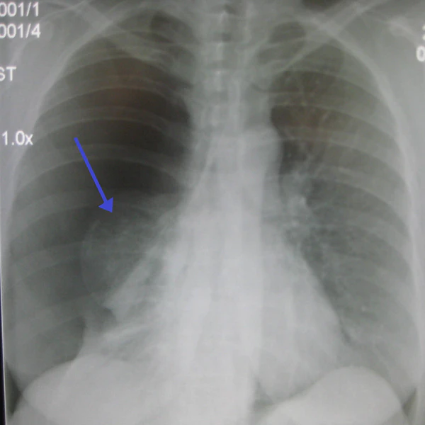 - Для подтверждения диагноза необходимо проведение рентгенографии грудной клетки (оптимальная проекция — переднезадняя, при вертикальном положении больного).