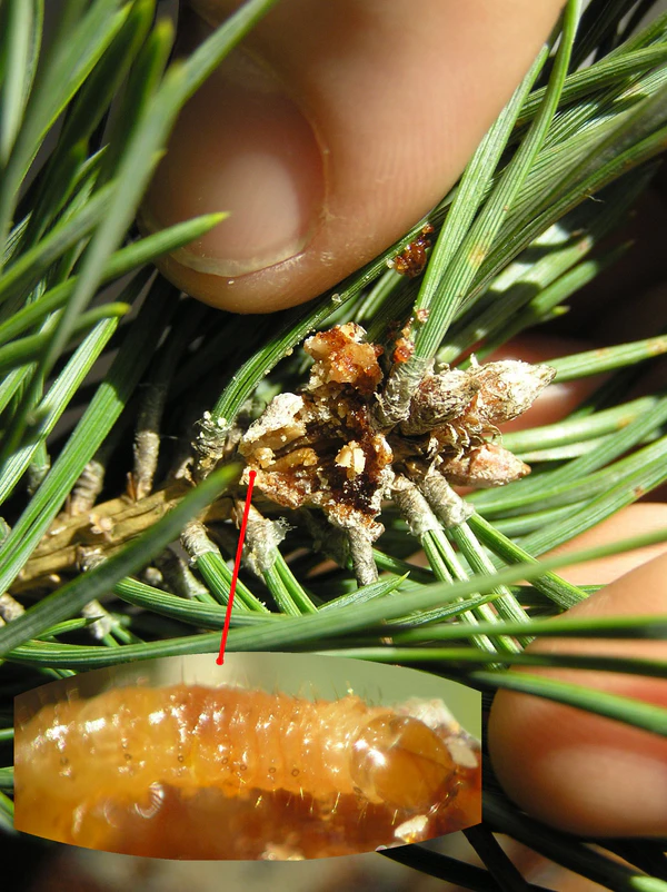 После спаривания самки откладывают яйца по одному вблизи влагалища хвоинок либо возле почек, включая верхушечную, молодых сосен. Свежеотложенные яйца — светло-желтого цвета, продольно-овальной формы, размерами 1,1×0,8 мм. Со временем становятся коричневыми. Стадия яйца длится 2—3 недели.