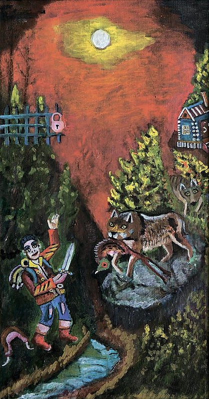 Верхнюю часть композиции занимает красное небо с белой луной, окружённой зелёно-жёлтыми облаками. Слева, на вершине холма, расположена решётка с большим замком. У подножия холма находится мужчина в сине-красном костюме с крупным кинжалом. Справа у края полотна изображён деревенский дом, от которого отходят два волка, один из которых держит в зубах мёртвую птицу. Необычная цветовая гамма и сочетание реальных и фантастических элементов придают работе выразительную символику.