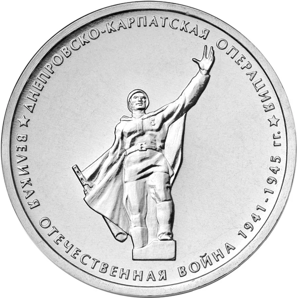 - на реверсе в центре расположено рельефное изображение фрагмента монумента «Победа» в городе Кривой Рог, по окружности имеются надписи: «ДНЕПРОВСКО-КАРПАТСКАЯ ОПЕРАЦИЯ» и «ВЕЛИКАЯ ОТЕЧЕСТВЕННАЯ ВОЙНА 1941—1945 ГГ.», разделённые двумя звёздочками.