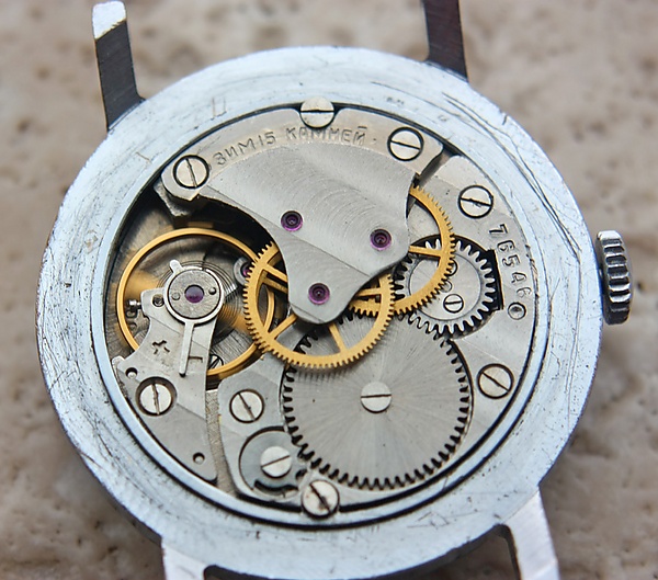 Механизм часов «Победа» содержит 15 рубиновых камней, баланс без противоударного исполнения. Циферблат с боковой секундной стрелкой.