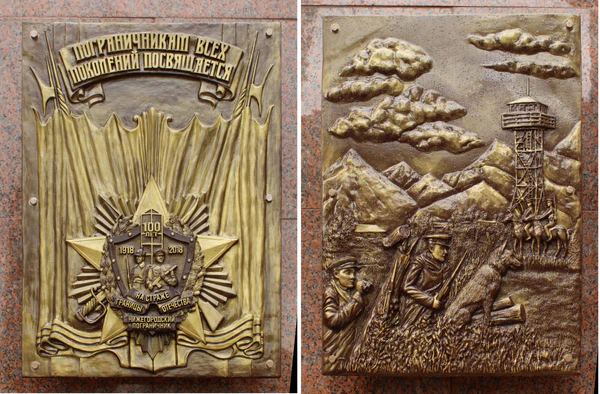 - Барельеф (пограничник с собакой) Брест — Карелия (со стороны ул. Минина). На первом плане изображен пограничный наряд «Секрет» в составе двух вооружённых пограничников со служебной собакой. На дальнем плане, на фоне гор изображены: пограничный наряд «Дозор» на лошадях, пограничная наблюдательная вышка. На барельефе изображены все основные символы охраны Государственной границы 20-х, 60-х годов.