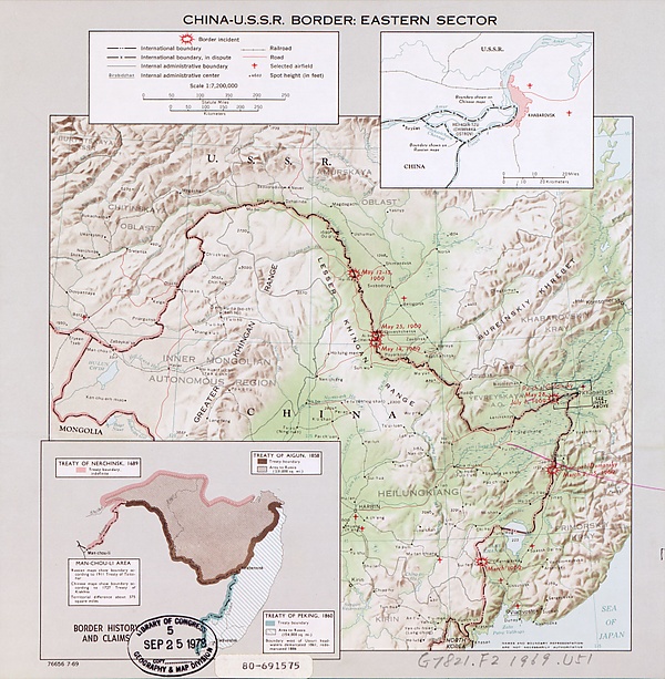 После Парижской мирной конференции 1919 года появилось положение, что границы между государствами должны, как правило (но не обязательно), проходить по середине главного фарватера реки. Но и оно предусматривало исключения, вроде проведения границы по одному из берегов, когда подобная граница сложилась исторически — по договору или если одна сторона колонизировала второй берег до того, как его начала колонизировать другая[5]. Кроме того, международные договоры и соглашения не имеют обратной силы[6]. Тем не менее в конце 1950-х годов, когда КНР, стремясь к росту своего международного влияния, вступила в конфликт с Тайванем (1958) и участвовала в пограничной войне с Индией (1962), власти КНР использовали новые положения о границах как повод для пересмотра советско-китайской границы. Руководство СССР было готово пойти на это, и в феврале 1964 года начались консультации по вопросам границы[7]; однако они закончились безрезультатно. В связи с идеологическими разногласиями в ходе культурной революции в Китае и после Пражской весны 1968 года, когда власти КНР заявили, что СССР встал на путь «социалистического империализма», отношения особо обострились. Островной вопрос был представлен для китайской стороны как символ советского ревизионизма и социал-империализма[8].