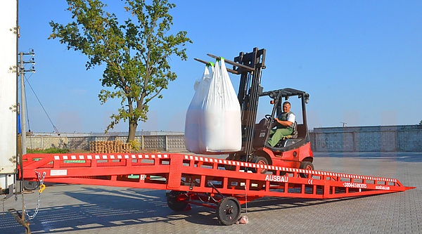 Мобильная (передвижная) рампа выполняет похожие задачи, что и стационарная, но, благодаря встроенной транспортной базе, имеет ряд преимуществ, среди которых – возможность свободно перемещаться по складу с помощью погрузчика. Также, мобильные рампы имеют гидравлическую систему, что позволяет выставить рампу на необходимую высоту (от 90 до 165 см). Для надежной фиксации используют цепи и стопорные тормоза.