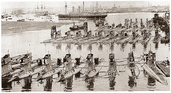 В конце XIX века появились лодки с электрической силовой установкой, затем с бензиновой и дизельной для надводного плавания и с электрической для подводного. Впервые подводные лодки были применены в русско-японской войне. Экипажи их набирались на добровольной основе из числа офицеров и матросов надводных кораблей. До 1906 года подводные лодки за отсутствием специальных разработок по тактике и стратегии ведения подводной войны числились миноносцами.