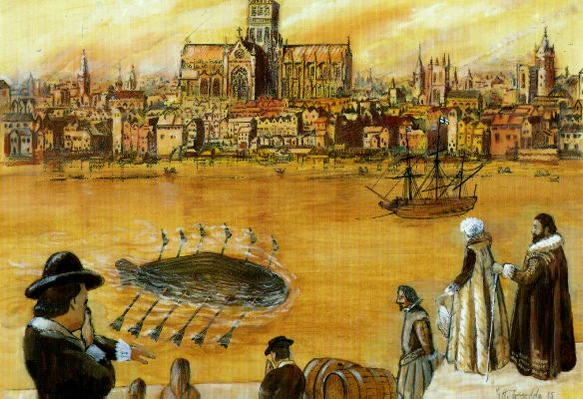 Англичанин Уильям Боурн (Борн) в 1578 году разработал проект подводной лодки[2]. Это должна была быть полностью закрытая лодка, обшитая водонепроницаемой кожей, которая бы приводилась в движение посредством гребли под водой.
