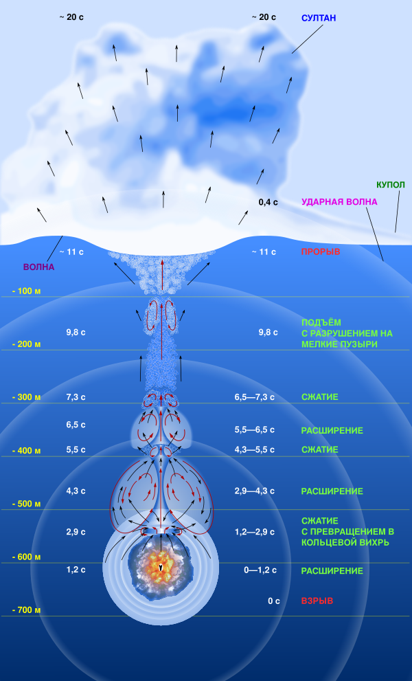 Вслед за подводной ударной волной на поверхность выходит горб воды, выталкиваемой пузырём: купол переходит в так называемый взрывной султан, состоящий из последовательных кольцеобразных выбросов воды в виде струй и всё более мельчающих брызг. Тем временем снизу ударная волна отражается от дна и устремляется обратно к пузырю. | ||