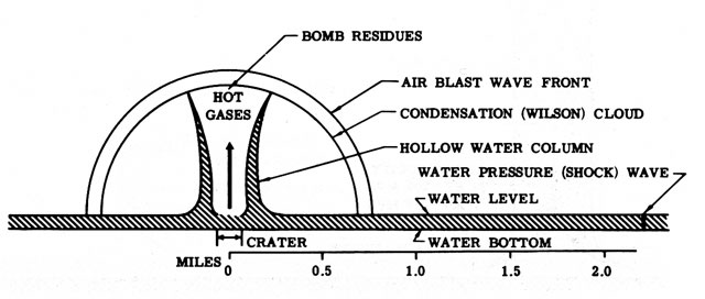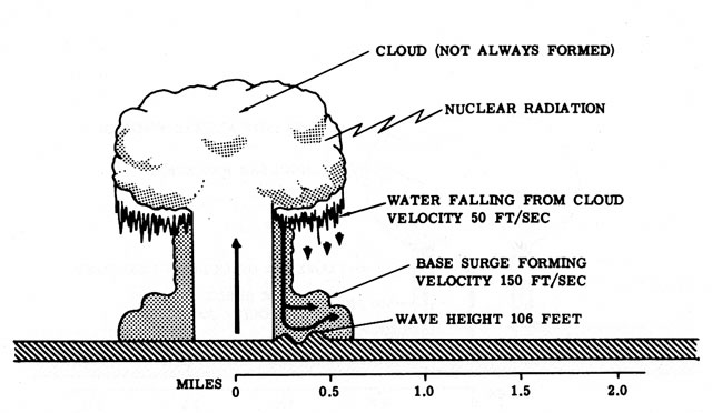 Неглубокий подводный взрыв — один из самых эффектных видов ядерного взрыва, к тому же случайный наблюдатель может увидеть взрывные эффекты в непосредственной близости с расстояния в несколько километров, не потеряв при этом зрение и не сильно пострадав от ударной волны. Смертельно опасные «сюрпризы» придут к нему только через несколько минут в виде радиоактивного тумана с дождём и волн типа цунами.