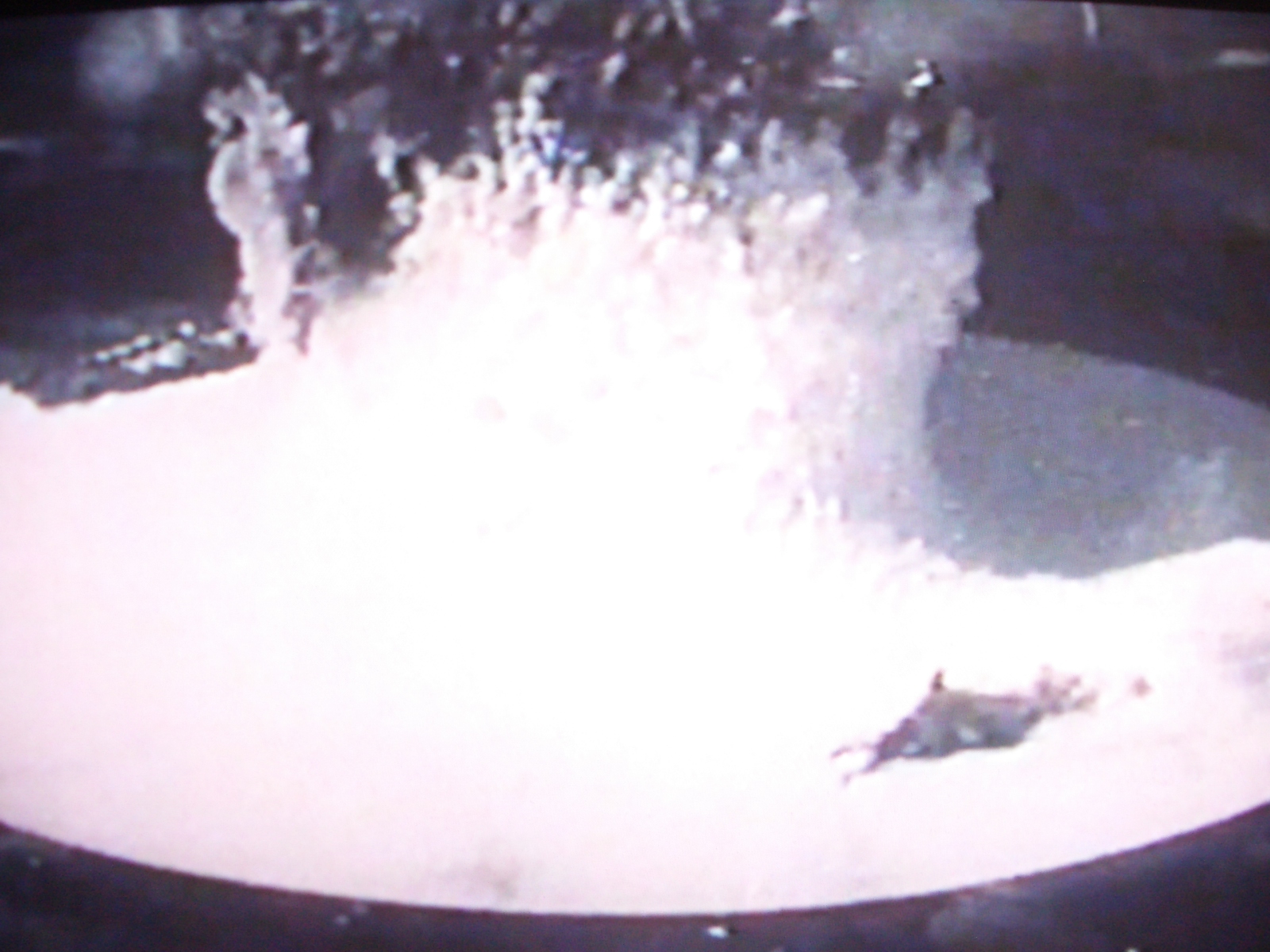 Султан достигает высоты свыше 1500 м, продолжая расширение[лит 3] (С. 95, 302, 304). Пузырь, перешедший в воронку, выбрасывает последние нижние брызги султана и выталкивает воду, борта воронки становятся огромной волной высотой около 100 м. Умеренные повреждения кораблей (возд. 0,04 МПа)[лит 13] (С. 214). | |