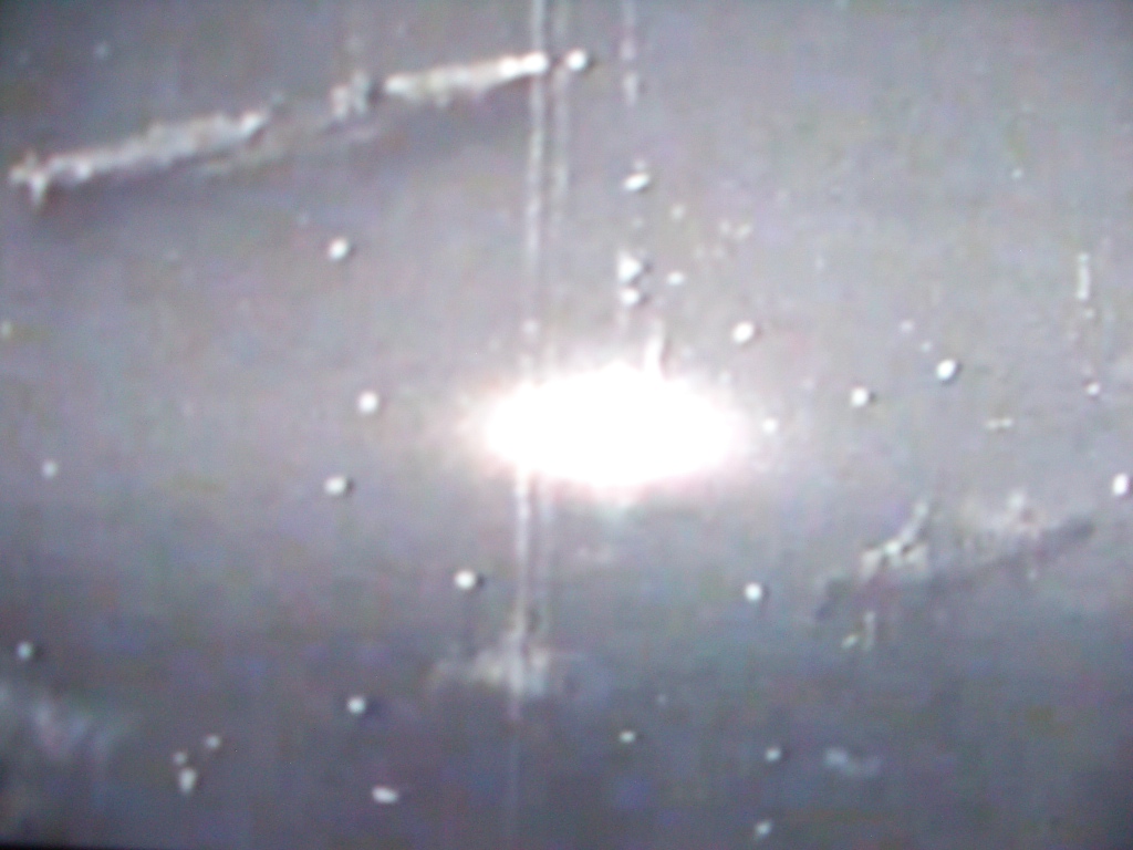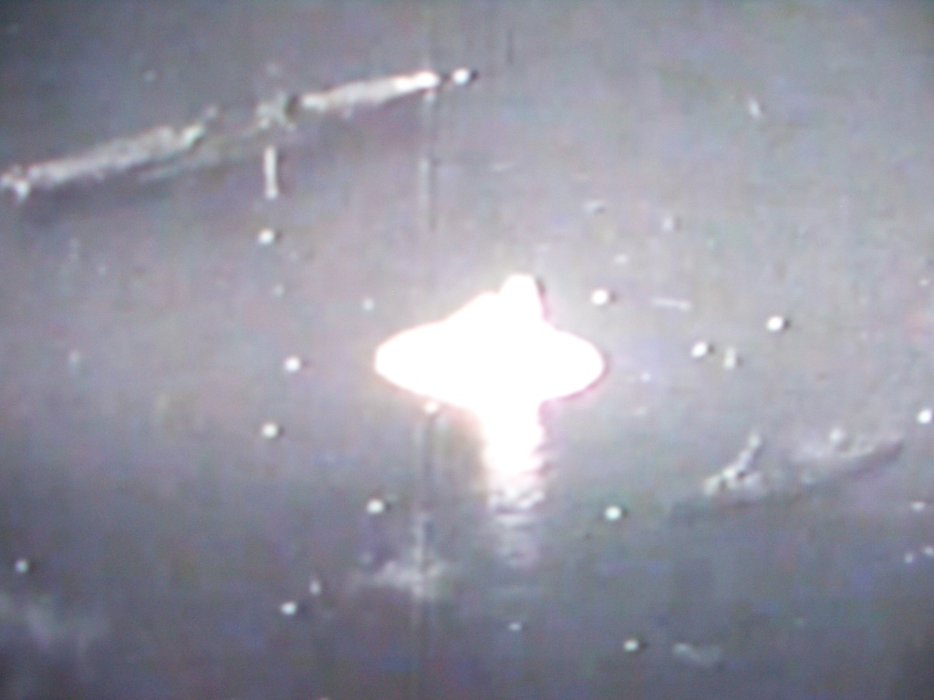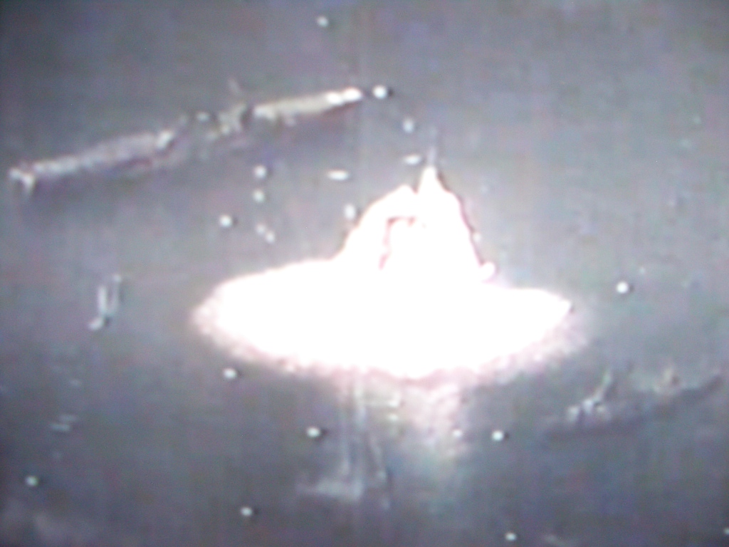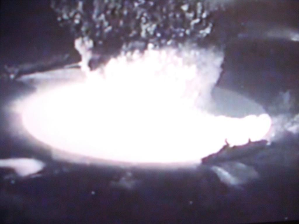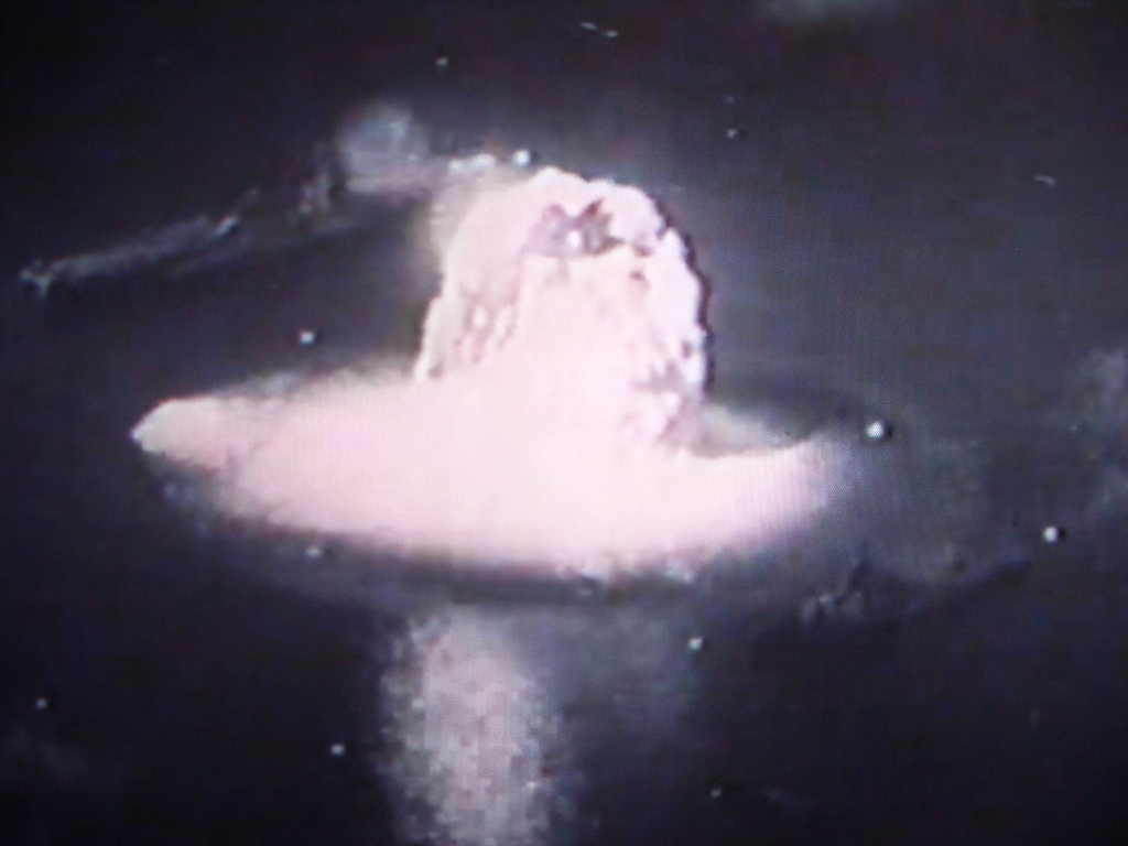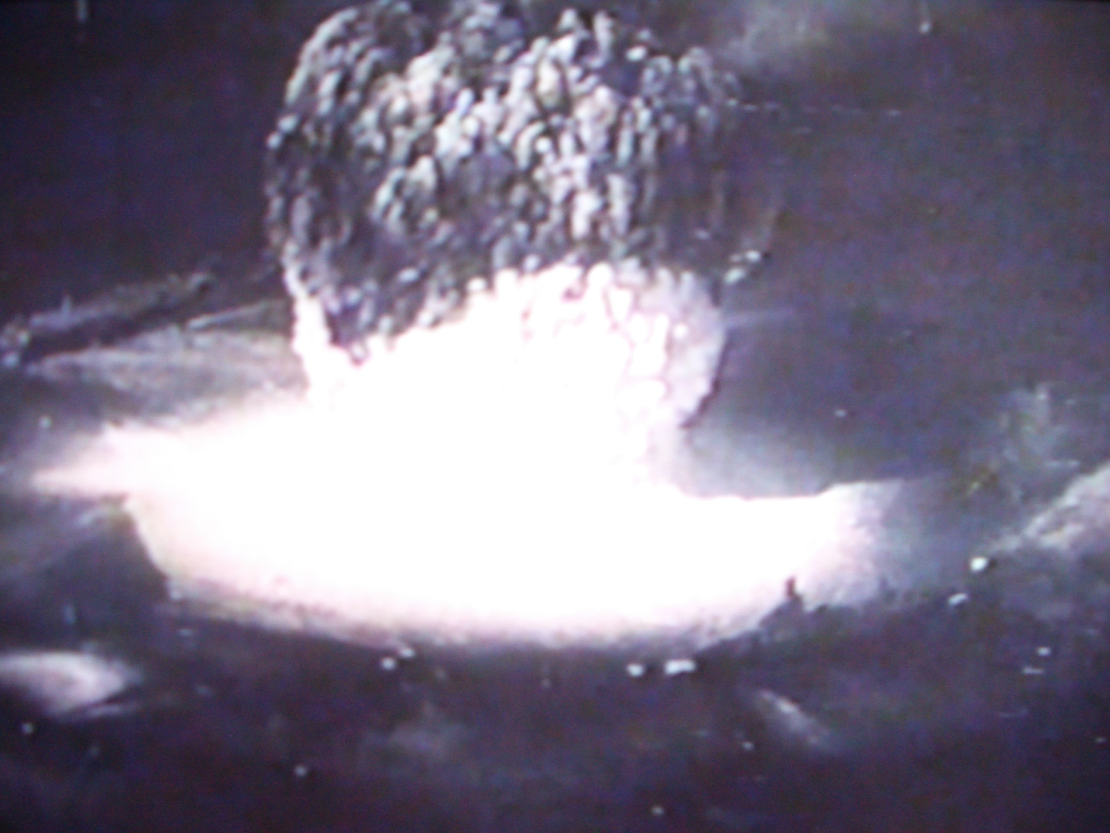 Рентгеновское излучение формирует тепловую волну, испаряющую воду вокруг заряда; яркостная температура тепловой волны ~1000 К[лит 10] (С. 199), снаружи свечение похоже на свет через матовое стекло[лит 6] (С. 40) | ||