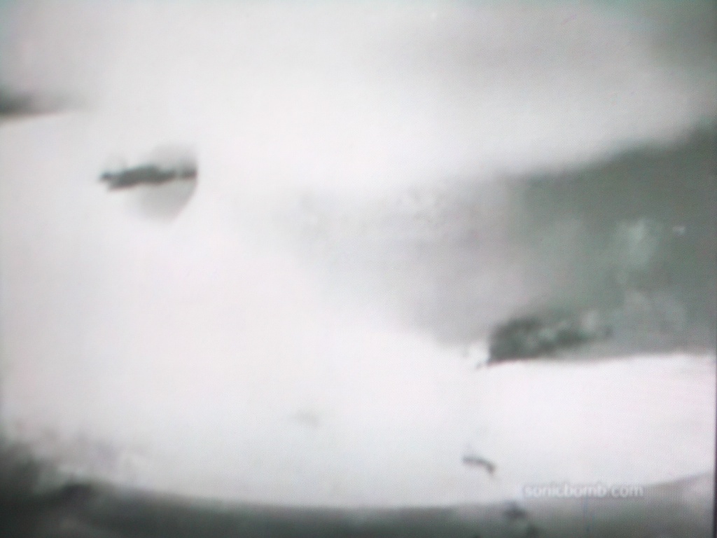 Султан изначально движется со сверхзвуковой скоростью 300–500 м/с[лит 11] (С. 257) и своим толчком создаёт вторую воздушную ударную волну[лит 1] (С. 750, 783). Пузырь с подходом к поверхности выталкивает новые порции глубинных вод. Корабль в эпицентре под действием ударной волны и выброса воды разрушается на мелкие части и разбрасывается в радиусе несколько км. | |||