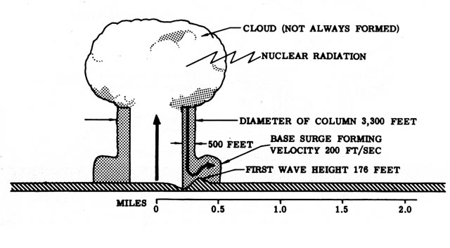 | 3,7 км | 0,014 МПа | Значительные разрушения портовых сооружений, складов (0,014 МПа)[лит 6] (С. 157). В дальнейшем на первый план выходят поднятые в воздух радиоактивные брызги и волны поверхности воды. | |||