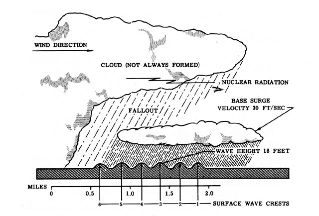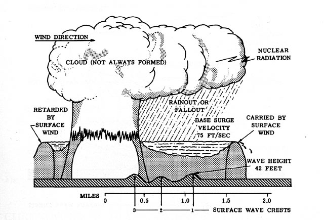 - быстрое падение излучения из-за разрежения взвеси, выпадения осадков и распада радионуклидов, в связи с чем от базисной волны необходимо защищаться только в течение первых минут после взрыва, например закрыться в герметичной каюте, пока не развеется облако[лит 6] (С. 247).