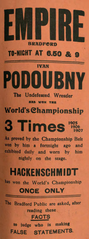 11 сентября 1907 года в газете Bradford Daily Argus борец Георг Гаккеншмидт высказывал сомнения в чемпионских титулах Поддубного, просил предоставить информацию о том, кто организовывал чемпионаты 1905 и 1907 годов[12].