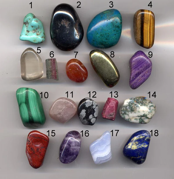 Дымчатый кварц, гематит (кровавик), янтарь (сукунцит), горный хрусталь, жадеит, нефрит, лазурит, малахит, авантюрин, чароит.