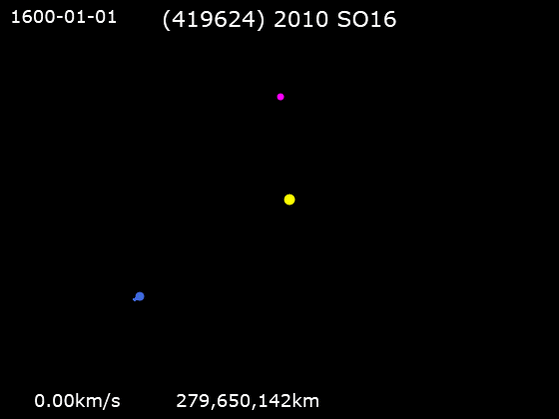 Далее в качестве примера будем рассматривать астероид, движущийся вокруг Солнца по подковообразной орбите рядом с Землёй. Астероид находится практически на том же расстоянии от Солнца, что и Земля и движется с нею в орбитальном резонансе 1:1, совершая один оборот вокруг Солнца за то же время, что и Земля (плюс-минус пару часов).