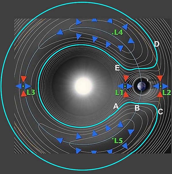 Предположим, что астероид находится на внутреннем кольце земной орбиты в точке «А» вблизи троянской точки L5. Период обращения астероида вокруг Солнца чуть меньше одного земного года. Поскольку астероид находится ближе к Солнцу, чем Земля, его орбитальная скорость выше и он догоняет Землю. Далее астероид приближается к Земле на достаточно близкое расстояние, где под влиянием земного гравитационного поля на астероид вдоль его орбиты начинает действовать внешняя ускоряющая сила, которая увлекает астероид на более высокую орбиту и вызывает приращение его скорости. Данный эффект увеличения скорости тела в гравитационном поле других планет широко используется для разгона земных космических аппаратов, направляемых для исследования внешних областей Солнечной системы. Но хотя сама скорость движения астероида увеличивается, значение орбитальной её составляющей вследствие перехода на более высокую орбиту падает. В точке «B» орбитальная составляющая скорости движения астероида снижается настолько, что становится равной орбитальной скорости Земли, и астероид некоторое время движется почти синхронно с нею. Но поскольку он по-прежнему находится в зоне действия земной гравитации, внешняя ускоряющая сила по-прежнему продолжает на него действовать, вызывая дальнейшее приращение скорости и переход на более высокую орбиту. Спустя ещё какое-то время астероид переходит на внешнее кольцо земной орбиты в точку «С», где его орбитальная скорость становится меньше орбитальной скорости Земли, и он начинает отставать от неё. Дальнейшие несколько сотен лет астероид проведёт спокойно двигаясь по своей орбите постепенно удаляясь от Земли со стороны точки L5 и приближаясь к ней со стороны точки L4. Период обращения астероида вокруг Солнца чуть больше одного земного года. В конце концов астероид догоняет Землю и оказывается с другой её стороны в точке «D» вблизи троянской точки L4. Как только астероид вновь входит в зону влияния земной гравитации, начинается процесс, обратный происходившему вблизи точки L5. Происходит торможение астероида, вследствие чего он начинается спускаться на более низкую орбиту. При этом его орбитальная скорость постепенно возрастает, пока астероид вновь не окажется на внутреннем кольце земной орбиты в точке «E». Из этой точки в течение ещё нескольких сотен лет он будет спокойно двигаться опережая Землю и всё сильнее удаляясь от неё, пока в какой-то момент времени вновь не окажется в точке «A», с которой цикл начнётся вновь.
