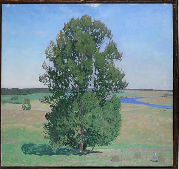 В центре композиции находится большое одинокое дерево с раскидистой кроной, занимающее почти всю вертикаль холста. Под деревом справа расположены три стога скошенной травы и фигурка женщины, формующей один из стогов, что подчёркивает характерную для пасторали идиллическую сцену сельской жизни. Вдали открывается перспектива лугов, полей и кромки леса на горизонте. На втором плане справа изображена излучина реки, а слева — ещё одно одинокое дерево. Верхнюю часть полотна занимает изображение голубого неба.