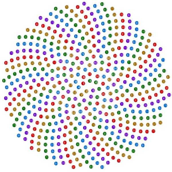 где θ — угол, r — радиус или расстояние от центра, а n — номер цветка и c — константа. Это форма спирали Ферма