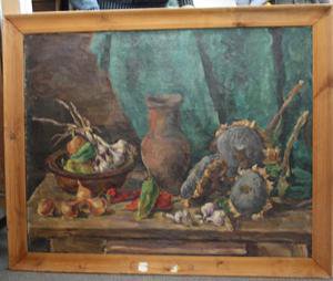 Полотно выполнено в горизонтальном формате и представляет собой натюрморт. В центре композиции на столешнице размещена кринка, перед которой лежат стручки красного и зелёного перца. Справа изображены три спелых шляпки подсолнуха с головками чеснока перед ними. Слева располагаются луковицы, а за ними — чаша с овощами. Фоном служит вертикальная плоскость коричневого цвета, украшенная лазурной драпировкой.