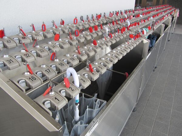 В офисах зданиях использование ограничено дождливыми днями, когда сотрудники и посетители берут с собой зонтики. Они складывают зонтики и размещают их на подставках для зонтов при входе в здание и забирают их с подставок для зонтов при выходе из здания.[11] Функция подставок для зонтов в данном случае состоит в том, чтобы не допустить попадания мокрого зонта в здание, смачивающего по всей поверхности пол.[12]