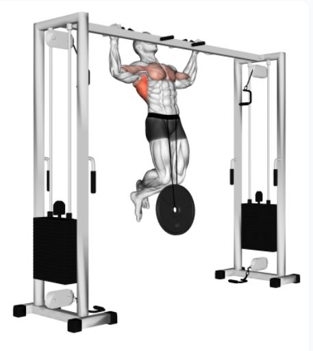 Упражнение включает использование дополнительного веса в виде пояса с отягощением, утяжелённого жилета или гантели, зажатой между ног. |