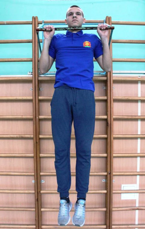 Необходимо подтянуться так, чтобы подбородок поднялся выше грифа перекладины, затем опуститься в вис и, зафиксировав исходное положение на 1 секунду.
