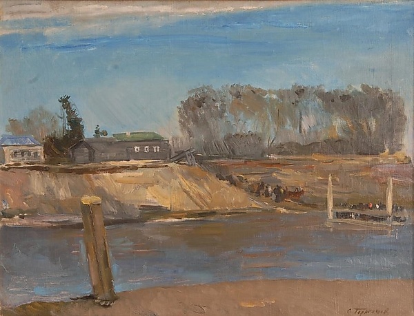 На полотне представлен весенний пейзаж, в центре которого протекает река, по которой движется паром. На высоком берегу, расположенном на втором плане, изображена группа людей, ожидающих прибытия парома. У линии горизонта слева видны одноэтажные деревянные дома, а справа — группа деревьев. Композиция построена с использованием оттенков сине-голубого, серо-коричневого и охры, что формирует характерную для весны цветовую гамму.