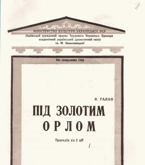 - Галан, Ярослав Олександрович. Під золотим орлом: Трагедія на 4 дії. Серія: Б-ка сучасної драматургії. Мистецтво, 1975