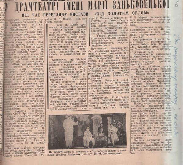 «Спектакль заньковчан [„Под золотым орлом“] очень понравился студентам факультета журналистики и рабочим комсомольско-молодежной смены изоляторного завода.»
