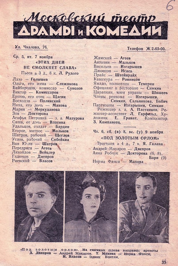 - Сталинабадский театр русской драмы театр им. Маяковского (1952, режиссёр Леонид Ицков)