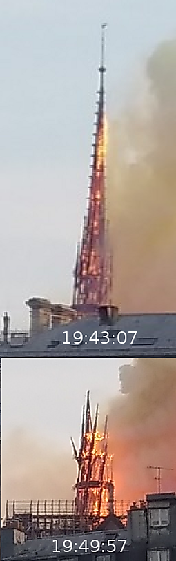 Шестнадцать медных статуй, окружавших основание шпиля, были сняты 11 апреля 2019 года для реставрации, поэтому они не были затронуты огнём.
