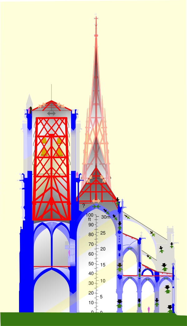 Источник возгорания располагался в верхней части здания, на мансарде в основании шпиля, спроектированного архитектором Виолле-ле-Дюком. Большая часть загоревшейся деревянной конструкции представляла собой каркас, сооружённый в XII—XIII веках из 1300 дубов. Сверху находились свинцовые листы, расплавившиеся в огне. В течение часа пламя объяло свинцово-деревянную крышу собора и центральный деревянный шпиль, что привело к его обрушению на свод потолка каменной кладки собора[10][11].