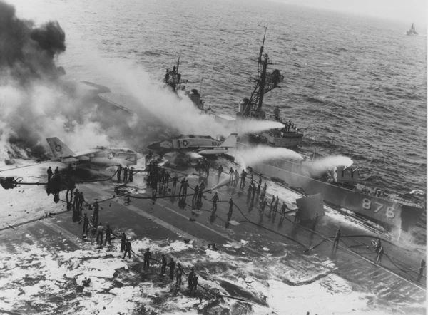 На помощь горящему авианосцу пришли атомный крейсер «Bainbridge» и эсминец «Rogers»[9]. На тушение пожаров объединённым экипажам трёх кораблей потребовалось около четырёх часов[8].