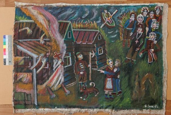 Полотно представляет собой жанровую сцену, выполненную в стиле наивного искусства. На переднем плане слева изображена река, по берегу которой тянется горящий лес, а рядом находится лиса. На реке плывёт лодка с двумя людьми, к борту которой прильнул медведь; ниже по течению виден плывущий олень, выше — волк. На противоположном берегу изображён охотник с поднятым ружьём и собакой. Здесь же расположена изба, возле которой в траве сидит заяц. Композиция насыщена деталями, отражающими сцены из сельской жизни и природы.