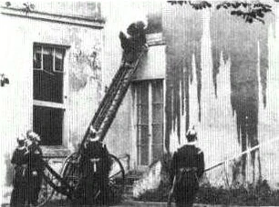 Вторая сцена показывает казармы пожарных. Полицейский стучит в дверь казармы, дергает за звонок. Пожарные открывают и он рассказывает о происшествии. Пожарные одеваются, запрягают лошадей в повозку с насосом и уезжают галопом.
