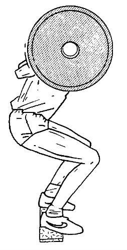 - со штангой на плечах, ноги и туловище прямые, ступни ног на одной линии, параллельной грифу (в приседании со штангой);