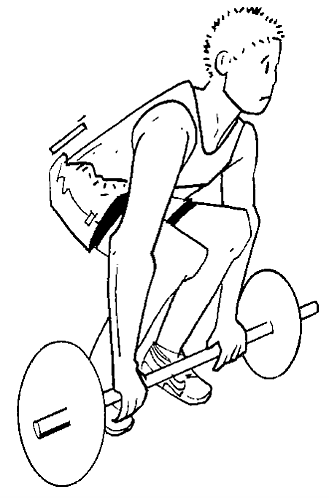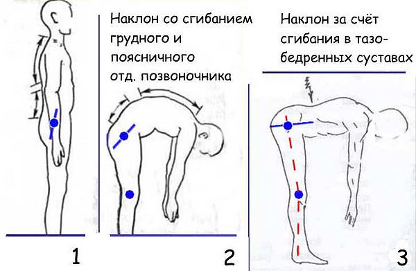 - в положении полного разгибания и поясничного и грудного отделов позвоночника, наклон туловища при этом осуществляется за счёт тазобедренных суставов (В этом случае нагружается в большей степени более прочный задний опорный комплекс).