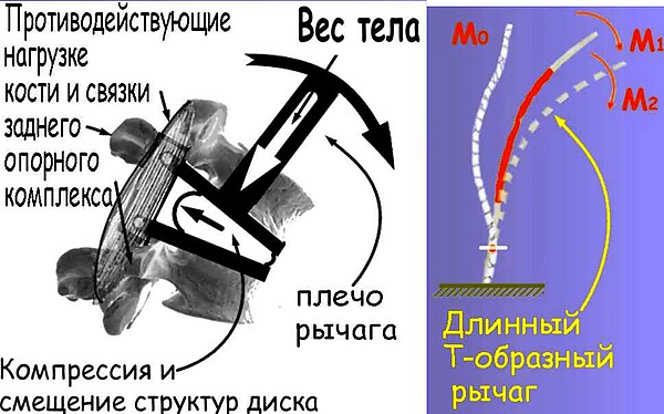 Наклон туловища вперёд всегда связан с избыточными нагрузками на грудной и в большей степени, на поясничный отдел позвоночника. Этой нагрузке противодействуют кости и связки заднего опорного комплекса позвоночника, а также эластичное сопротивление сжимаемых и смещаемых структур межпозвонкового диска — переднего опорного комплекса. Если в положении вертикальной стойки вес тела равномерно распределяется на задний и на передний опорный комплекс, то при наклоне туловища вперёд возможны два варианта положения тела: