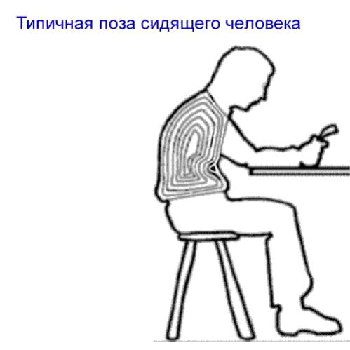 Сутулая поза сидя характеризуется максимальным сгибанием в поясничном и грудном отделах позвоночника, наклоном туловища вперёд.
