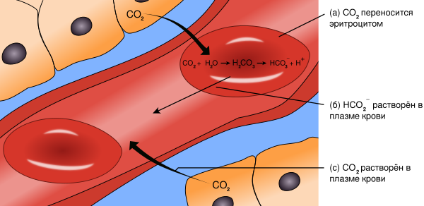 В тканях в процессе жизнедеятельности клеток образуется углекислый газ, откуда он попадает в тканевую жидкость и плазму крови. Однако из плазмы крови большая часть CO2 диффундирует в эритроциты. Там часть молекул CO2 реагирует с водой под действием фермента карбоангидразы, давая угольную кислоту H2CO3, которая диссоциирует на ионы H+ и HCO3-. После этого гидрокарбонат-ионы уходят в плазму, и вместо них в эритроцит входят ионы Cl- (этот анионный обмен называется сдвигом Хамбургера). Тем временем в эритроцитах оксигемоглобин отдаёт кислород, так как при высоком парциальном давлении CO2 сродство гемоглобина к кислороду снижается (эффект Холдена). Освободившийся гемоглобин связывает часть углекислого газа, диффундировавшего в эритроцит (так образуется карбоксигемоглобин), а другие молекулы гемоглобина связывают два протона, предотвращая закисление крови и появление эффекта Бора (при понижении pH (то есть повышении концентрации CO2) сродство гемоглобина к кислороду падает, что препятствует эффективному захвату кислорода в лёгких). В лёгочных капиллярах перечисленные реакции протекают в обратном направлении. Так как парциальное давление углекислого газа в альвеолах меньше, чем в венозной крови, CO2 уходит в альвеолы из карбоксигемоглобина в эритроцитах; кроме того карбоксигемоглобина, высвобождается также гемоглобин, связавший два протона. При этом парциальное давление углекислого газа в альвеолах растёт, и из-за этого увеличивается сродство гемоглобина к кислороду, который гемоглобин начинает связывать (эффект Бора). В обмен на ионы хлора ионы HCO3- входят в эритроцит, под действием карбоангидразы связываются с высвобожденными гемоглобином протонами, давая угольную кислоту. Последняя распадается на воду и углекислый газ, который также выходит из эритроцитов в альвеолы[9][10].