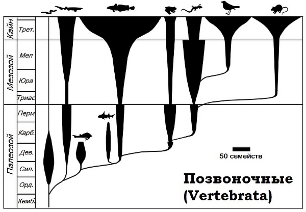 Позвоночные появились в нижнем кембрии[15], а в юре существовали уже представители всех известных ныне их традиционных классов. Общее число современных видов около 40 тыс.