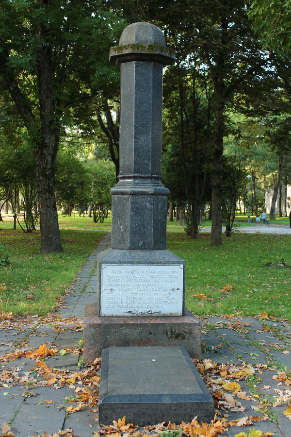 В 1934 году останки Л. М. Поземского были перенесены в сквер Павших борцов. На могиле был поставлен памятник из чёрного гранита с надписью: «Здесь погребен прах отважного героя-комсомольца Леона Поземского. 12 июня 1919 года, раненый в боях под Псковом на реке Кебь, попал в плен и был расстрелян белогвардейцами.